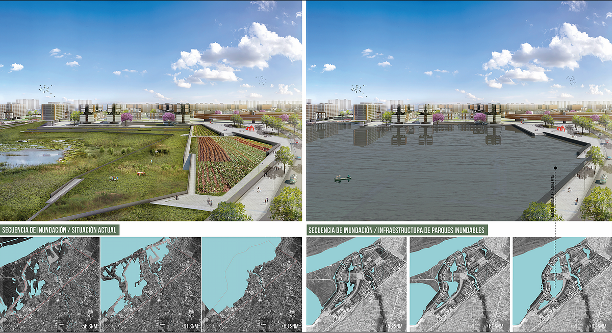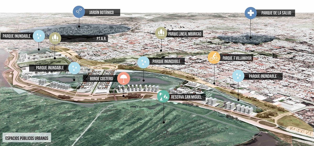 El parque Lineal Mburicao, el Parque Lineal y Avenida Florencio Villamayor, los Parques Reservas Inundables y el Frente Fluvial, conforman estos proyectos estratégicos mencionados. Encargados de funcionar como espacio público es- tructurante, áreas verdes recreativas y productivas; funcionan como ecosistema eficiente frente a la problemática de las inundaciones, formando parte de una infraestructura clave para el diseño propuesto.